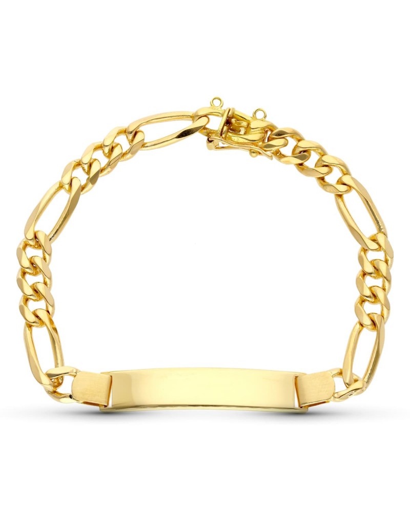 Esta elegante esclava masculina presenta una cadena tipo Figaro en oro amarillo de 18 quilates con eslabones alternados que crean un patrón visual distintivo. La chapa central rectangular lisa ofrece una superficie perfecta para personalización, mientras que el acabado pulido refleja la luz creando un brillo dorado característico.