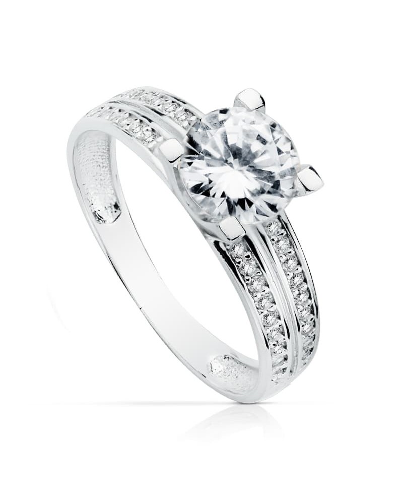 Este sofisticado solitario presenta un diseño clásico con un toque contemporáneo en oro blanco de 18 quilates. La pieza destaca por su circonita central de 7 mm perfectamente tallada, que se alza majestuosa sobre un aro elegantemente decorado con circonitas más pequeñas engastadas en doble fila a ambos lados del engaste principal.
