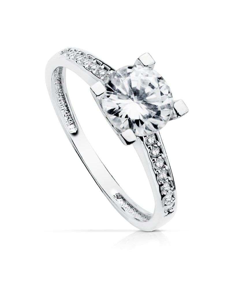 Este sofisticado anillo solitario presenta un diseño clásico y atemporal en oro blanco de 18 kilates. La circonita central de 7mm destaca brillantemente engarzada en un elegante montaje de 4 garras que maximiza su luminosidad, mientras que las circonitas laterales del aro aportan un destello adicional que realza toda la pieza.
