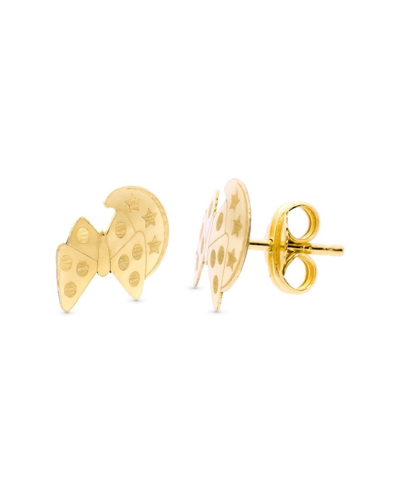 Pendientes de oro de 18k con con una mariposa y una luna en oro amarillo y un tamaño de 9 x 8mm. Tiene un cierre de presión Estos pendientes forman parte de la colección oro de Falomir joyas. Los pendientes incluyen marca de contraste 750, sello oficial y se entrega con estuche de la marca.