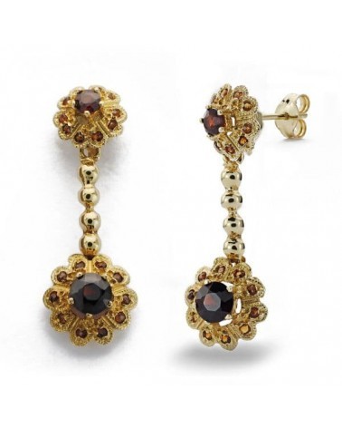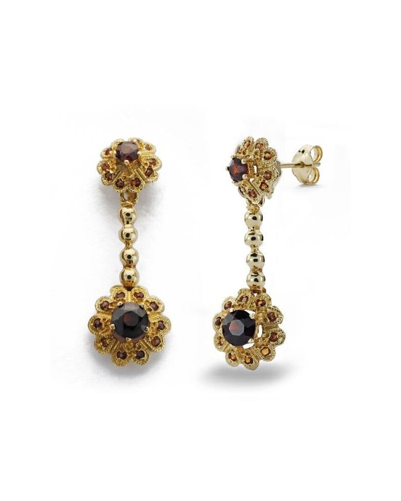Estos sofisticados pendientes largos presentan un diseño de inspiración clásica con dos motivos florales que destacan por su elegancia y refinamiento. Cada pendiente combina flores decoradas con piedras de color granate que crean un hermoso contraste con el oro amarillo, unidas por una delicada cadena de esferas doradas que aporta movimiento y distinción al conjunto.