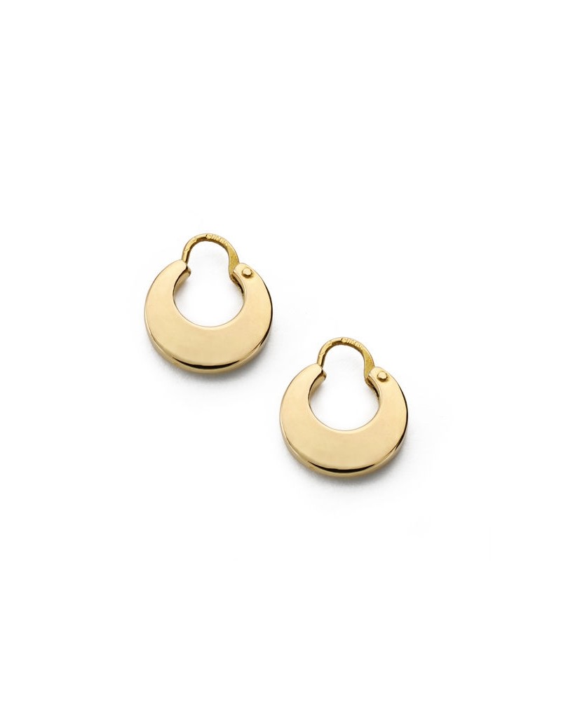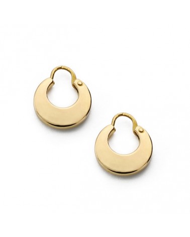 Aros de oro amarillo de 18 quilates con diseño liso y clásico de 11 mm de diámetro y peso aproximado 1,0 gramos. Su acabado pulido brillante y su tamaño discreto los convierten en unos pendientes perfectos para el día a día.