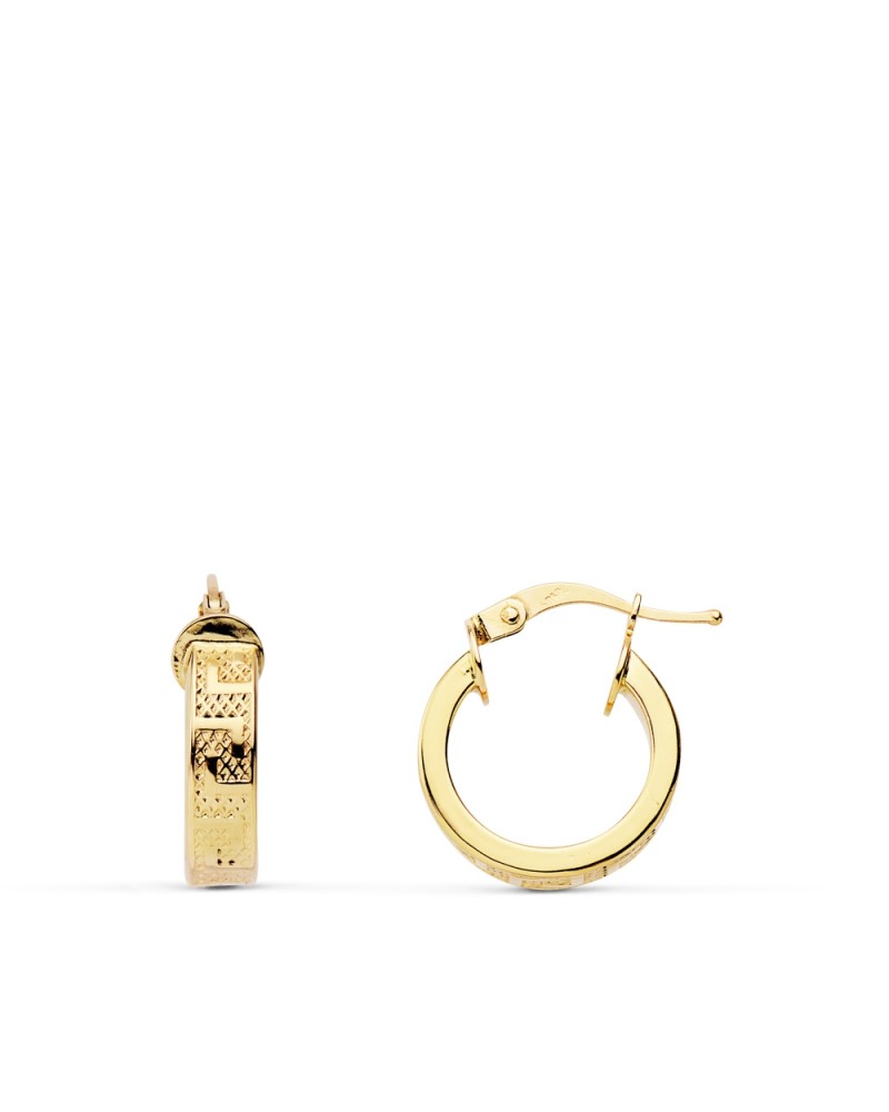 Estos elegantes aros de oro amarillo presentan un sofisticado diseño de greca hueca que los convierte en una pieza única y llamativa. El patrón geométrico tradicional se combina con el acabado hueco que aporta ligereza y modernidad, creando un juego visual muy atractivo que refleja la luz de manera especial.