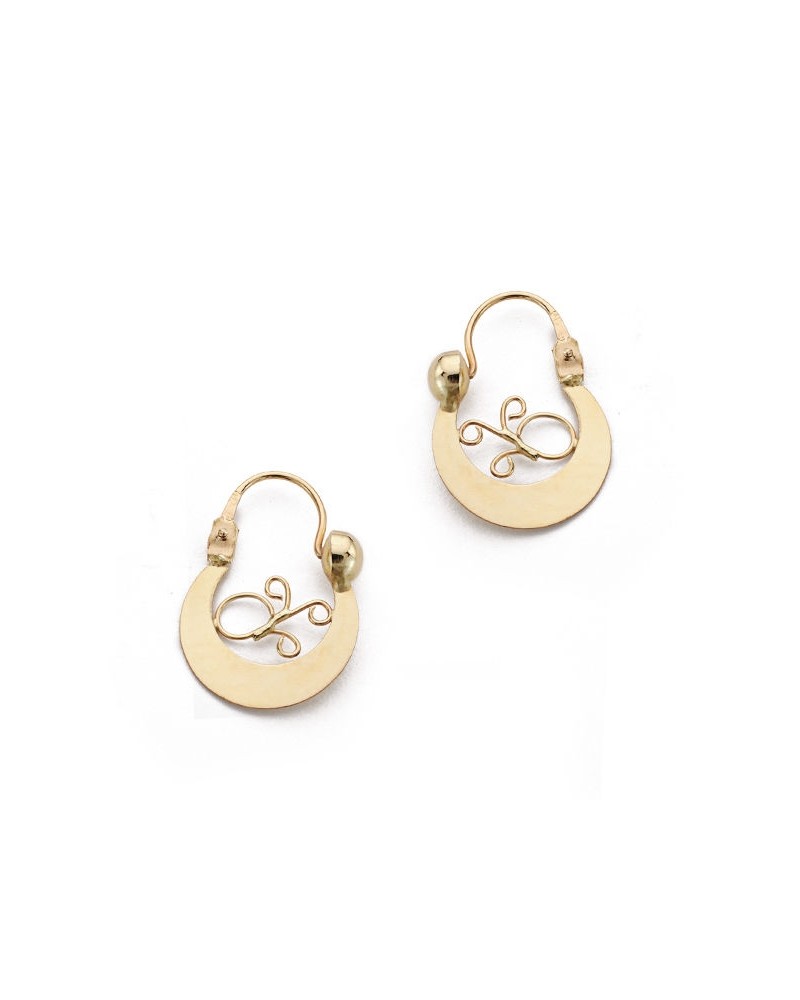 Aros de oro amarillo de 18 quilates con diseño calado y elegante voluta decorativa en el centro. Con medidas de 17x13 mm y peso aproximado 1,0 gramos, estos pendientes combinan tradición y estilo contemporáneo.