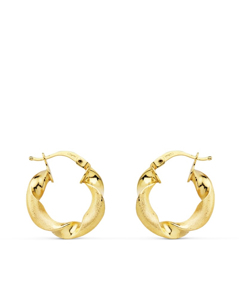 Fabricados en oro amarillo de 18 quilates con construcción hueca, estos aros de 18 mm de diámetro ofrecen un peso aproximado de 2,3 gramos, lo que los hace muy cómodos para llevar durante todo el día. Su diseño torcido no solo es estéticamente atractivo, sino que también aporta resistencia estructural manteniendo la ligereza característica de las piezas huecas.