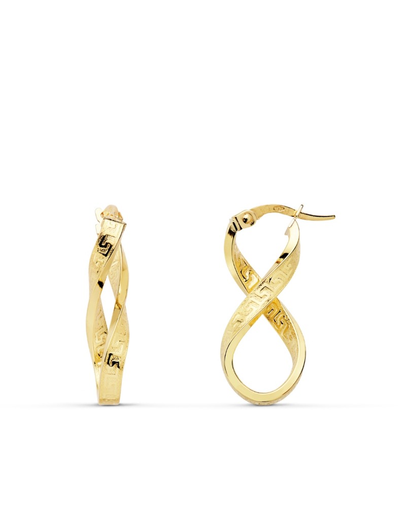 Aros de oro amarillo de 18 quilates con elegante diseño de forma de ocho y decoración de greca hueca. Con medidas de 26x16 mm y peso aproximado 2,6 gramos, incorporan cierre de gancho para una sujeción segura y cómoda.