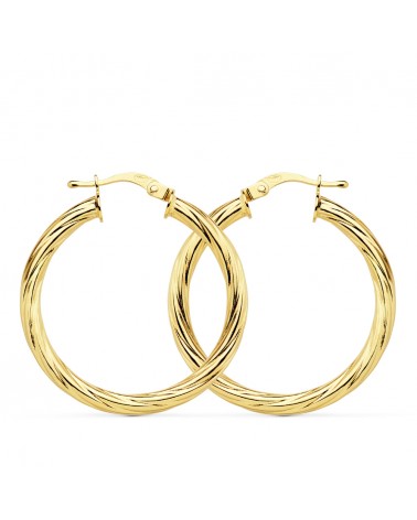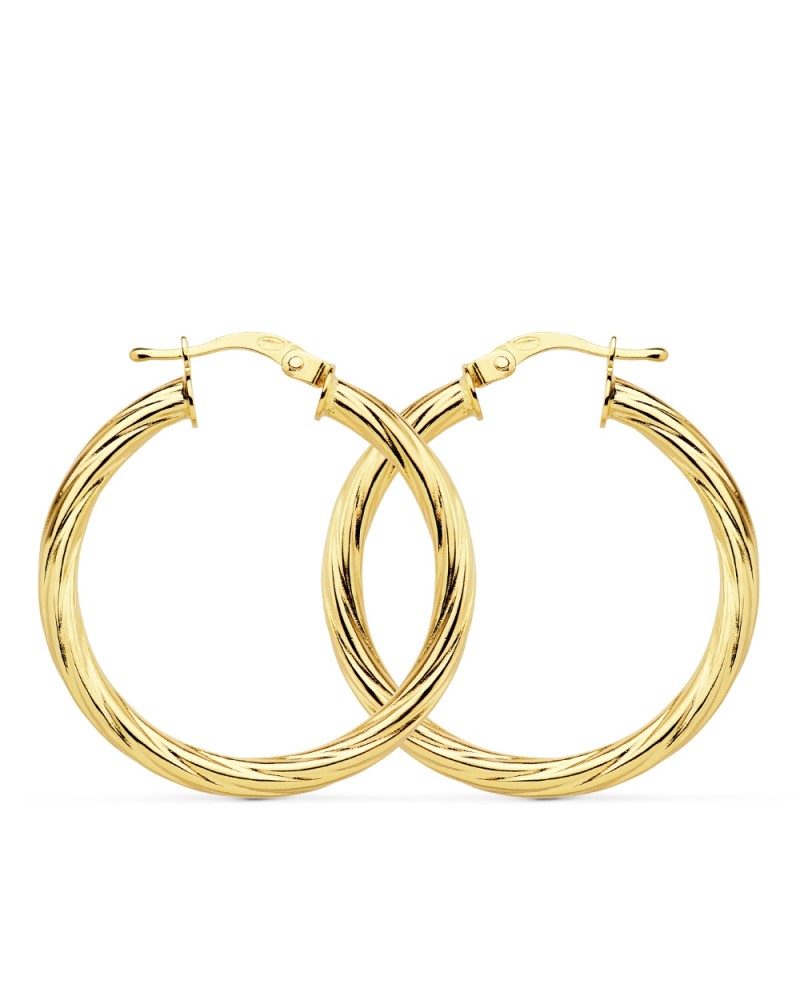 Fabricados en oro amarillo de 18 quilates con unas medidas de 29x3 mm y peso aproximado 2,4 gramos, estos aros combinan la elegancia tradicional con la comodidad moderna. Su sistema de cierre seguro garantiza un uso cómodo y fiable durante todo el día.