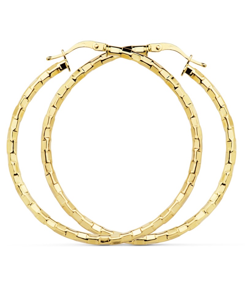 Elaborados en oro amarillo de 18 quilates, estos aros cuentan con un diámetro de 44mm y un peso aproximado de 3,2 gramos. Su cierre de tipo inglés garantiza seguridad y comodidad en el uso diario. El diseño cuadrado facetado no solo es estéticamente atractivo, sino que también optimiza la refracción de la luz.