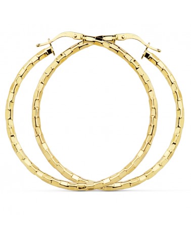 Estos elegantes aros grandes presentan un diseño cuadrado facetado que crea un juego de luces excepcional sobre la superficie del oro amarillo. Su construcción hueca los hace cómodos de llevar a pesar de su generoso tamaño, mientras que su acabado brillante refleja la luz de manera espectacular, aportando luminosidad al rostro.