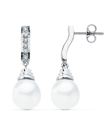 Estos sofisticados pendientes presentan un diseño de líneas depuradas donde las perlas naturales protagonizan la pieza. La parte superior cuenta con una barra de oro blanco engastada con circonitas que aporta un toque de luminosidad, mientras que las perlas cuelgan elegantemente creando un movimiento sutil y femenino. El acabado pulido del oro blanco realza el brillo natural de las perlas.