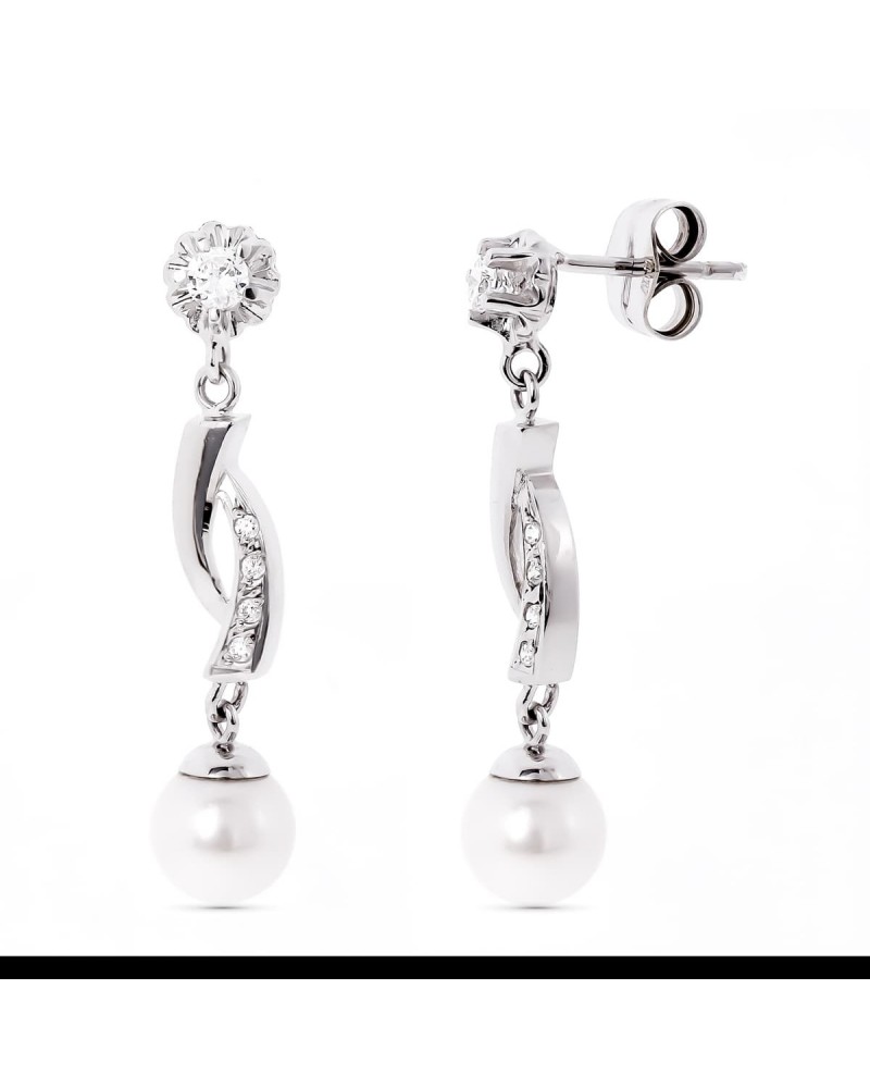 Estos sofisticados pendientes presentan un diseño alargado de gran elegancia, donde las perlas cultivadas de tono nacarado contrastan beautifully con el brillo del oro blanco. La parte superior muestra una circonita engastada con garra que aporta luminosidad, mientras que el elemento curvo intermedio, decorado con pequeñas circonitas, crea una transición armoniosa hacia la perla que pende en la parte inferior.