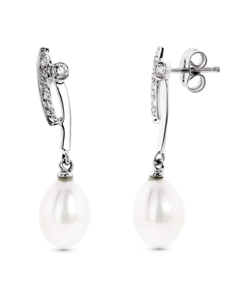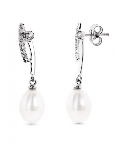 Elaborados en oro blanco de 18 kilates con peso aproximado de 3,1 gramos, estos pendientes incorporan circonita en la parte superior y perlas naturales que cuelgan delicadamente. Su cierre de presión garantiza una sujeción segura y cómoda durante todo el día.