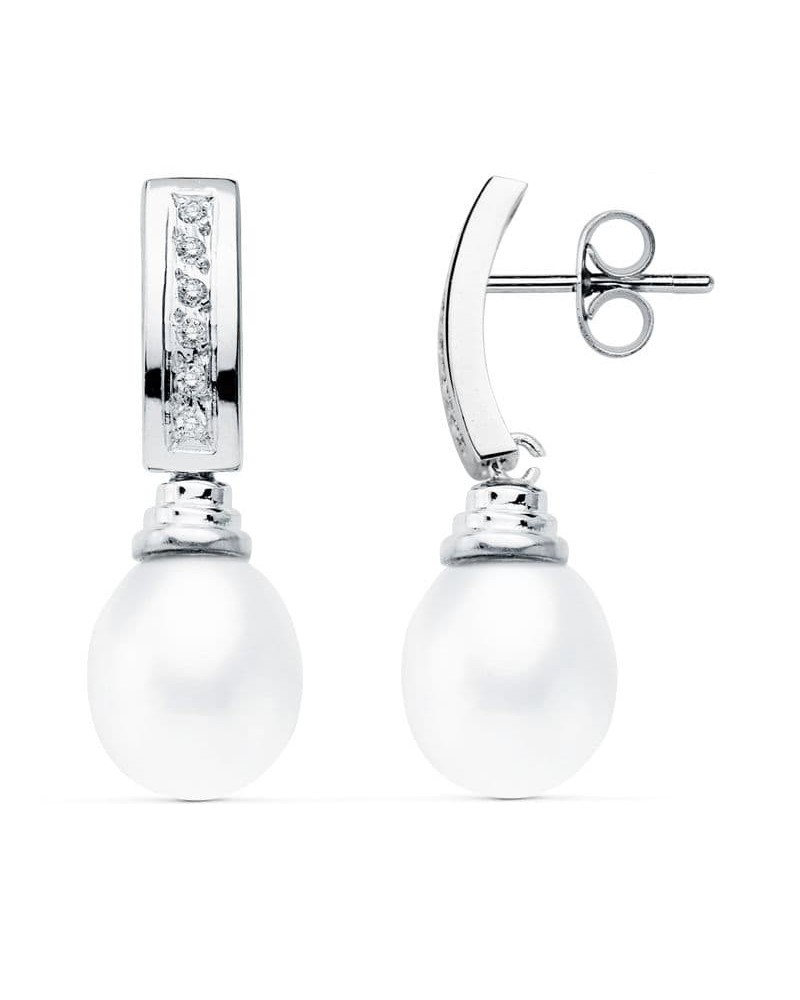 Pendientes oro blanco 18k perla cierre presión 30x9 mm