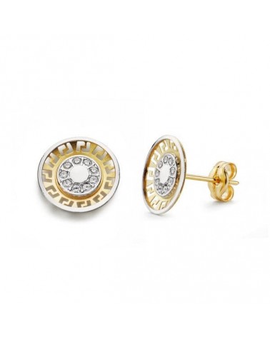 Estos elegantes pendientes presentan un diseño circular sofisticado con motivo de greca perimetral que combina oro amarillo y oro blanco en un acabado bicolor muy atractivo. El centro se ilumina con circonitas que aportan un brillo sutil y elegante, creando un contraste perfecto con el diseño geométrico de la cenefa.