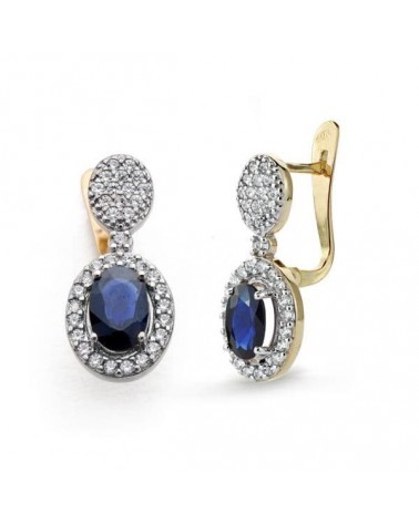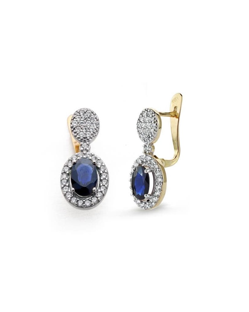 Elegantes pendientes de oro de 18 quilates bicolor con circonitas y piedra de color azul central en diseño ovalado. Medidas de 18x8 mm y peso aproximado 2,6 gramos. Incorporan cierre catalán para mayor seguridad y comodidad.