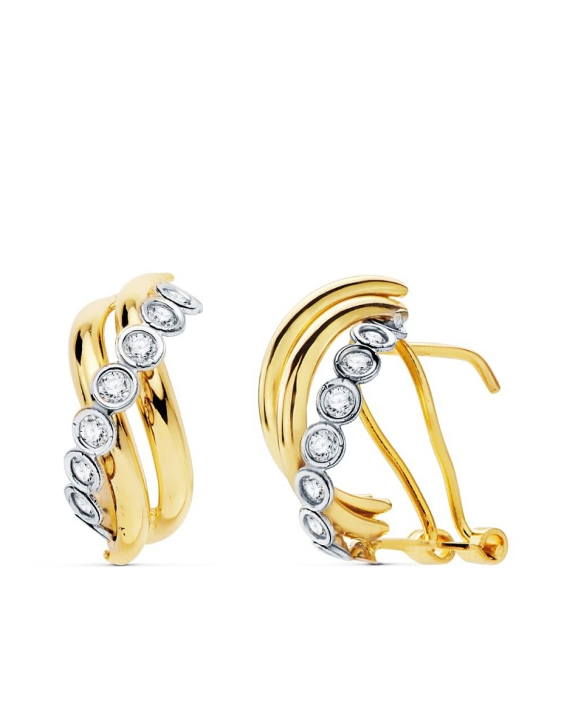 Estos elegantes pendientes muestran un sofisticado diseño bicolor que combina armoniosamente el brillo del oro amarillo con la distinción del oro blanco. Las bandas se superponen creando un efecto visual dinámico y moderno, donde las líneas curvas aportan movimiento y fluidez al conjunto. El contraste cromático entre ambos oros realza la belleza de cada tono y confiere a la pieza una versatilidad excepcional.