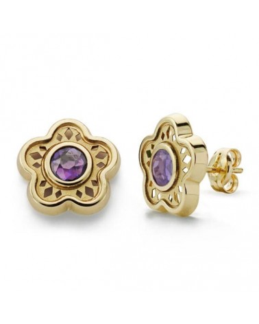 Estos pendientes presentan un diseño floral muy sofisticado, con una estructura calada que forma una delicada flor de cinco pétalos en oro amarillo 18k. En el centro de cada flor destaca una amatista de color violeta intenso que aporta un toque de color y elegancia al conjunto. El acabado pulido del oro realza tanto los detalles ornamentales de los pétalos como el brillo natural de la piedra.