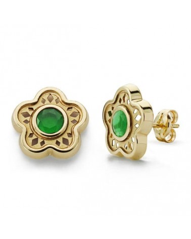 Estos deliciosos pendientes presentan un diseño floral muy elaborado, con forma de flor de cinco pétalos trabajados con detalle calado que aporta ligereza y movimiento a la pieza. En el centro destaca una piedra de color verde que proporciona un toque de color vibrante y elegante al conjunto dorado.
