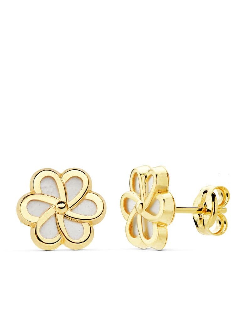 Pendientes oro 18k flor nácar 8mm cierre presión