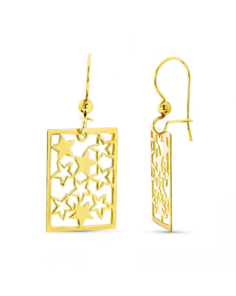 Estos preciosos pendientes destacan por su diseño rectangular calado que alberga en su interior un conjunto de estrellas de diferentes tamaños, algunas macizas y otras solo en silueta. El trabajo láser del oro amarillo de 18 kilates crea un efecto visual muy atractivo, con juegos de luces que resaltan la belleza del diseño celestial.