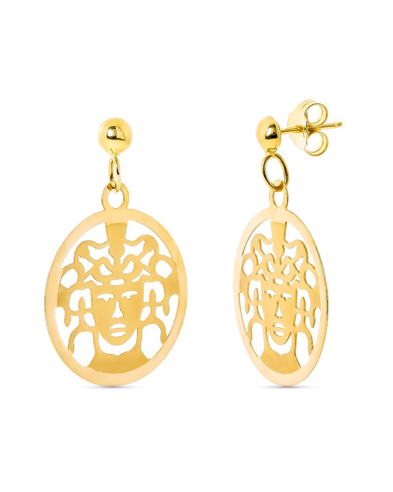 Estos elegantes pendientes presentan un sofisticado diseño circular con una medusa calada que destaca por sus líneas estilizadas y acabado pulido. El motivo mitológico se enmarca en un aro de oro amarillo que realza la belleza del calado, creando un juego de luces y sombras que aporta movimiento y elegancia a la pieza.