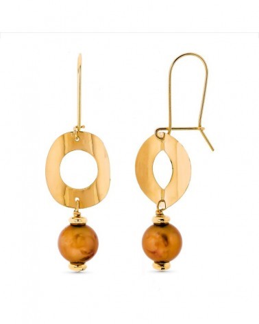 Estos elegantes pendientes largos destacan por su diseño contemporáneo que fusiona la pureza del oro amarillo con la calidez de las perlas de color. El diseño presenta aros redondos de oro pulido que enmarcan delicadamente las perlas de tonalidad ámbar, creando un contraste visual muy sofisticado. El estilo moderno pero atemporal los convierte en una pieza versátil de la colección perla.