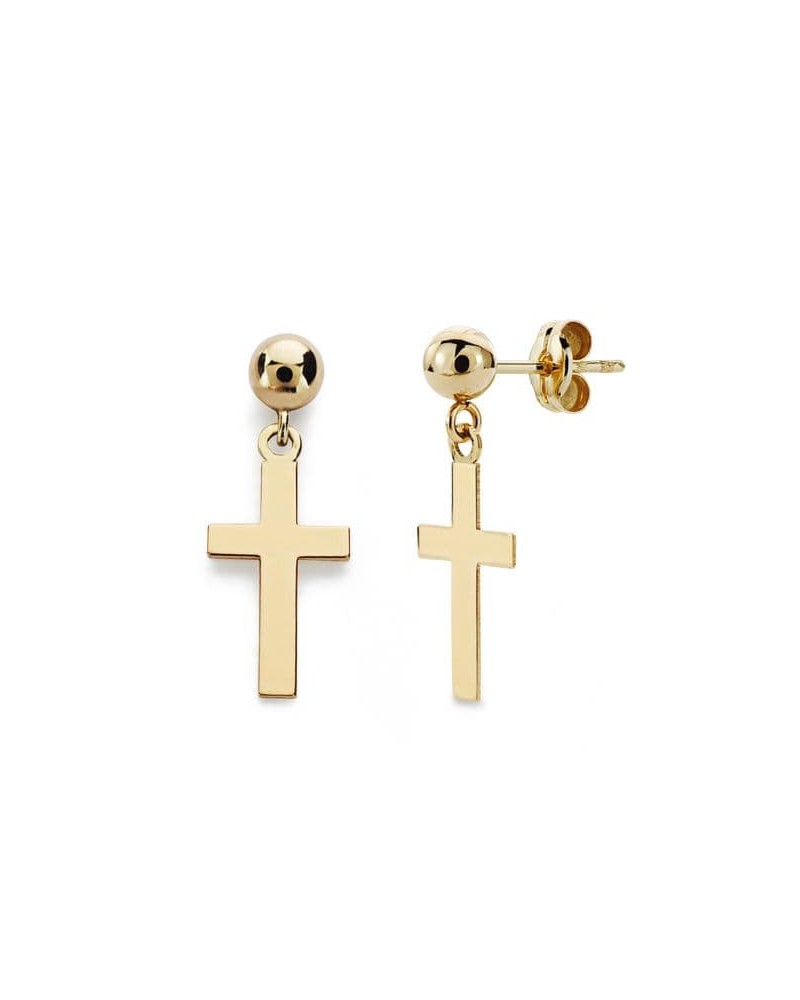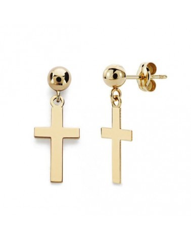 Elegantes pendientes de oro amarillo de 18 quilates con diseño de cruz colgante lisa que mide 12x7 mm. Presentan una pequeña bola dorada con cierre de presión de la que pende una delicada cruz de acabado pulido. Peso aproximado 0,7 gramos.