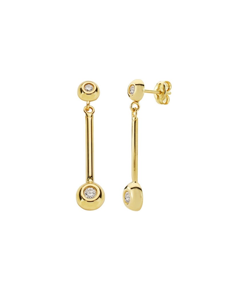 Estos elegantes pendientes largos destacan por su diseño moderno y sofisticado, con una barra vertical de oro amarillo 18k que conecta dos círculos con circonitas engastadas en chatón. El acabado pulido del oro amarillo realza la elegancia de las circonitas, creando un juego de luces muy atractivo que aporta luminosidad al rostro.