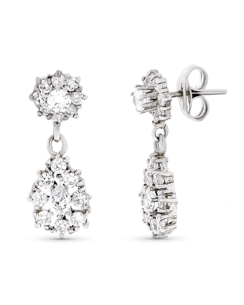 Estos espectaculares pendientes largos de oro blanco presentan un diseño de dos niveles que combina elegancia y sofisticación. La parte superior cuenta con un rosetón circular de circonitas alrededor de una piedra central, mientras que la parte inferior despliega un elemento ovalado también engastado con circonitas que aporta movimiento y luminosidad al conjunto.