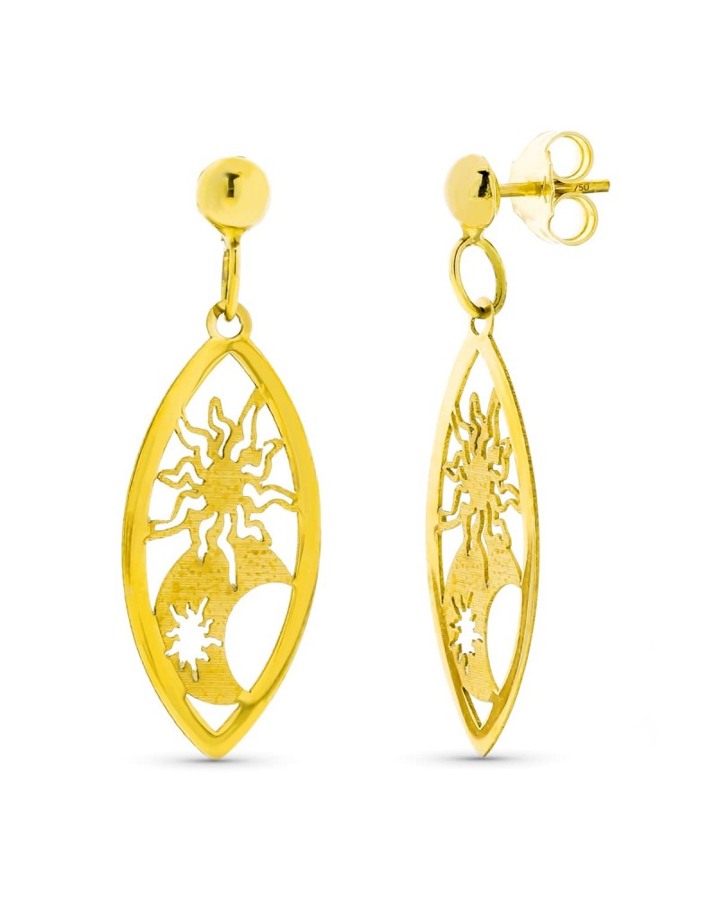 Estos elegantes pendientes de oro amarillo presentan un diseño calado muy sofisticado con motivos celestiales de sol y luna. Su forma ovalada alargada enmarca perfectamente los elementos decorativos: un sol radiante en la parte superior y una luna creciente en la inferior, creando una composición equilibrada y llena de simbolismo. El acabado calado permite el paso de la luz, dotando a la pieza de movimiento y luminosidad.