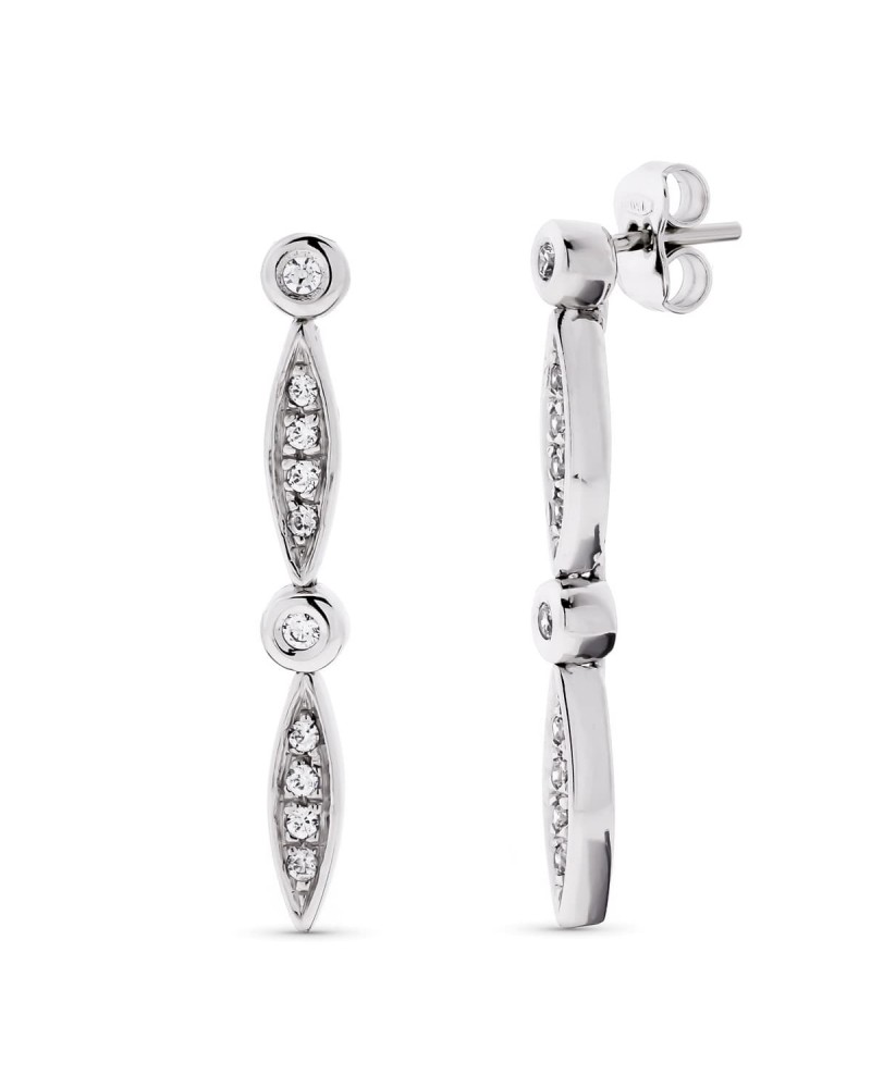 Elaborados en oro blanco de 18 quilates con acabado pulido brillante, estos pendientes tienen unas medidas de 30x4 mm y un peso aproximado de 3,9 gramos. Las circonitas están perfectamente engastadas en cada sección, tanto en los círculos centrales como en las formas elípticas alargadas. Su cierre de presión proporciona seguridad y comodidad durante todo el día.