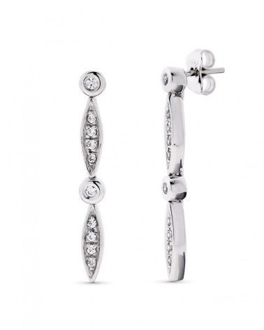 Estos elegantes pendientes largos presentan un diseño sofisticado en oro blanco de 18 quilates con un patrón vertical muy atractivo. La pieza combina formas geométricas circulares y elípticas que se alternan creando un movimiento visual dinámico, todas ellas engastadas con circonitas que aportan un brillo sutil y refinado.