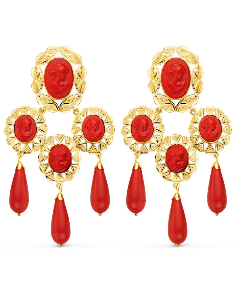 Elaborados íntegramente en oro amarillo de 18 quilates con acabado pulido brillante que realza cada detalle del tallado. Los camafeos tallados en coral rojo muestran perfiles femeninos clásicos, complementados por gotas de coral que aportan movimiento y elegancia. Con medidas generosas de 70x38mm y peso aproximado de 9,1 gramos, incorporan cierre catalán que garantiza comodidad y seguridad en el uso diario.