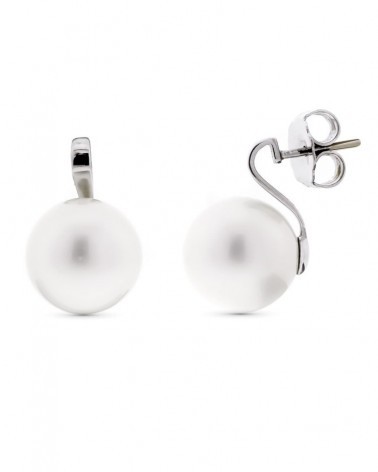 Elegantes pendientes de oro blanco de 18 quilates con perla de 15 mm de diámetro y cierre de presión. Su diseño clásico combina la elegancia del oro blanco con el brillo natural de las perlas. Peso aproximado 3,6 gramos.