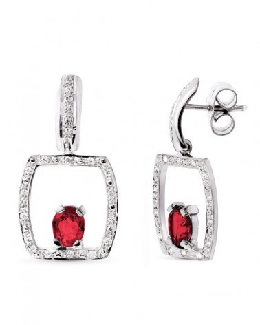 Estos sofisticados pendientes presentan un diseño geométrico contemporáneo con marco cuadrado abierto que enmarca elegantemente un rubí central. La piedra preciosa de intenso color rojo se encuentra engastada en garras de oro blanco, mientras que el marco cuadrado está delicadamente pavé con circonitas que aportan un brillo sutil y refinado al conjunto.