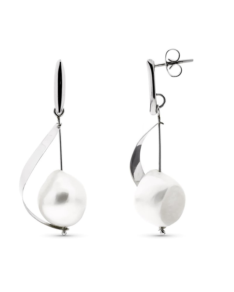 Pendientes largos de oro blanco de 18 kilates con perla natural y cierre de presión. Su diseño contemporáneo combina una barra curva que abraza delicadamente la perla, creando un efecto visual elegante y sofisticado con peso aproximado 3,6 gramos.