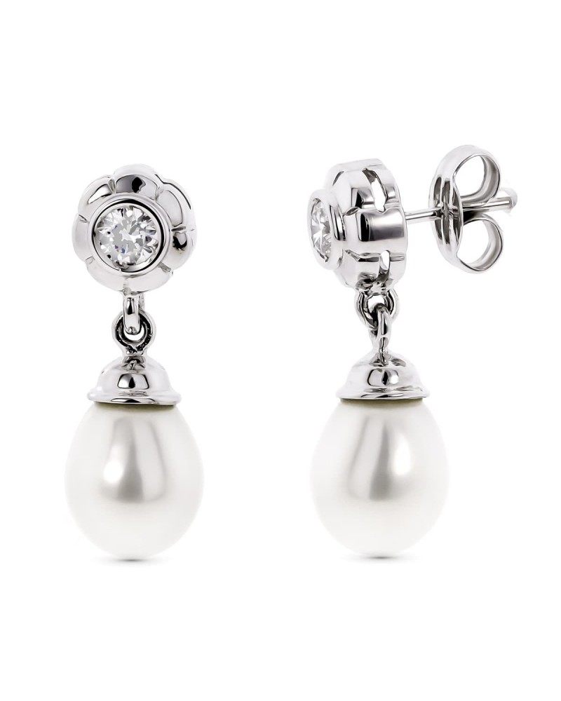 Estos refinados pendientes de oro blanco presentan un diseño atemporal que combina la luminosidad del metal precioso con la elegancia natural de las perlas. El engaste superior, trabajado con formas florales, alberga una circonita que refleja la luz con gran intensidad, mientras que la perla colgante aporta ese toque de distinción y feminidad característico de las joyas clásicas.