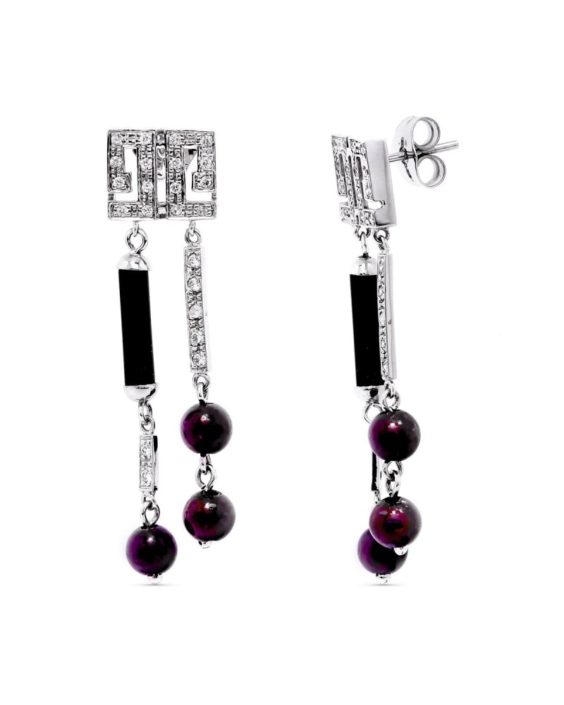 Estos elegantes pendientes largos de oro blanco destacan por su diseño sofisticado y contemporáneo. Presentan un motivo geométrico superior con circonitas que aporta luminosidad, del cual cuelgan elementos alargados en negro y llamativas bolas en tonos morados que crean un bonito contraste cromático. Su estilo colgante les confiere movimiento y presencia, perfectos para looks especiales.