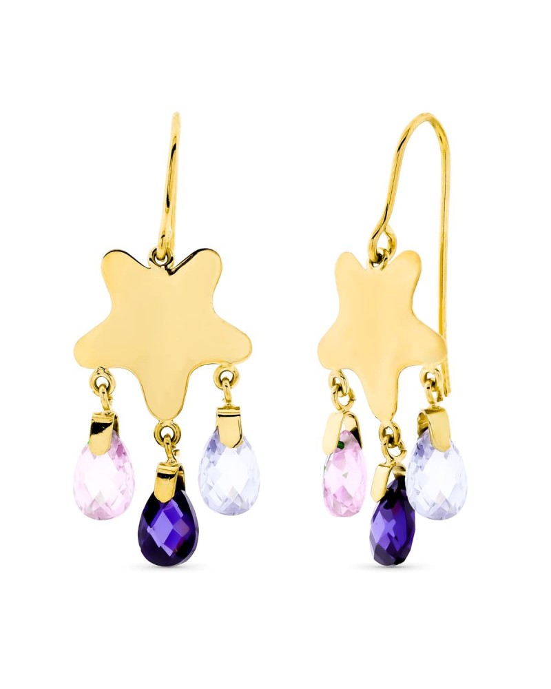 Estos elegantes pendientes presentan un diseño de estrella en oro amarillo pulido que sirve como base para tres delicados colgantes de piedras facetadas en tonos violeta intenso, rosa suave y cristal transparente. El contraste entre el dorado brillante de la estrella y los colores vibrantes de las piedras crea un efecto visual muy atractivo y sofisticado.