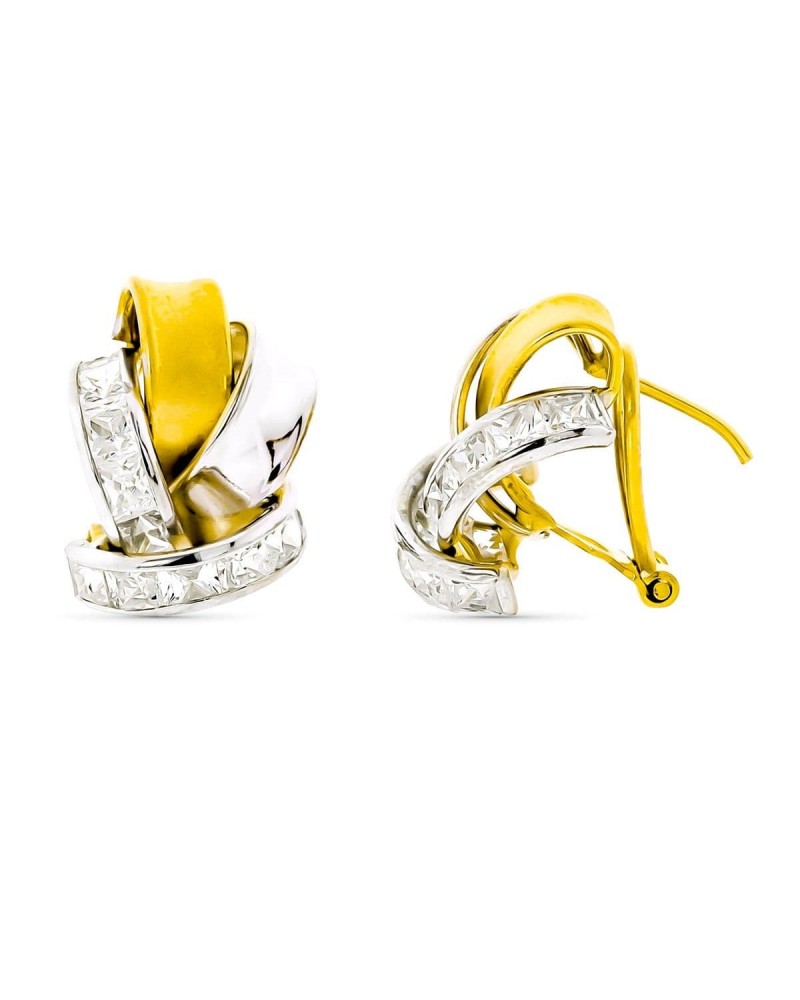Estos elegantes pendientes omega presentan un diseño contemporáneo con formas curvas y geométricas que crean un juego visual muy atractivo. El acabado bicolor combina oro amarillo y oro blanco de forma armoniosa, con superficies pulidas que reflejan la luz de manera espectacular. Las líneas entrelazadas y el volumen tridimensional del diseño aportan movimiento y sofisticación a la pieza.
