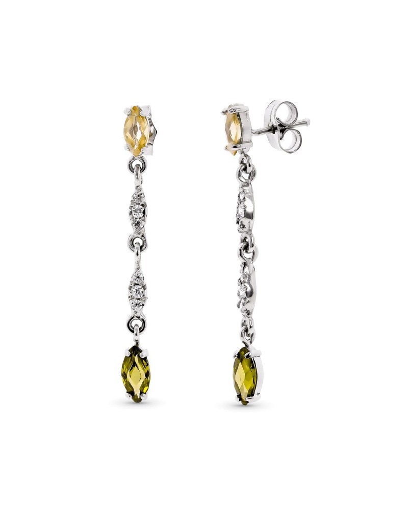 Estos pendientes largos de oro blanco presentan un diseño sofisticado de líneas fluidas que combina piedras de circonita en tonos dorados y verdes. La estructura colgante se inicia con una circonita amarilla en la parte superior, continúa con elementos decorativos intermedios y culmina con una circonita verde de talla marquesa que aporta un toque de color distintivo.