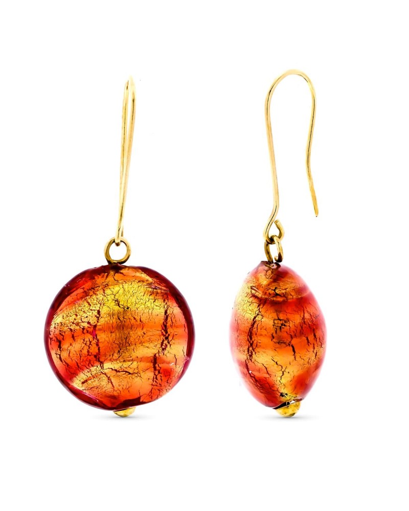 Elegantes pendientes de oro amarillo de 18 quilates con cristal de Murano en espectaculares tonos naranjas y rojos con efectos dorados. Medidas 41x18 mm y peso aproximado 2,9 gramos. Cierre de gancho cómodo y seguro.