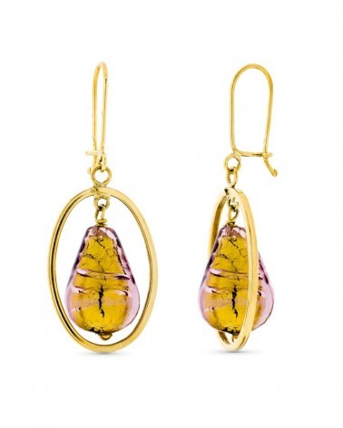 Estos elegantes pendientes de oro amarillo presentan un diseño sofisticado con piedras Murano doradas que destacan por sus tonos cálidos y vetas características. La piedra, de forma ovalada, queda suspendida dentro de un aro de oro pulido que enmarca perfectamente su belleza, creando un juego visual muy atractivo entre el metal precioso y el cristal artesanal.