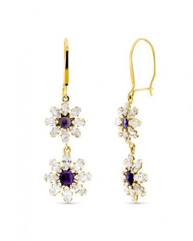 Pendientes oro 18k flores piedras moradas cierre gancho