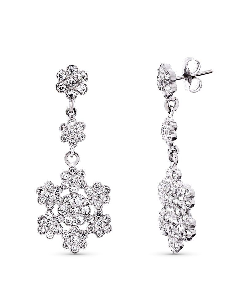 Estos elegantes pendientes largos de oro blanco presentan un diseño sofisticado con motivo floral escalonado. La composición se inicia con una pequeña flor de circonita en la parte superior, continúa con una flor intermedia y culmina en un conjunto de múltiples flores pequeñas que forman una silueta de gran belleza y movimiento. El contraste entre el oro blanco pulido y el brillo de las circonitas crea un efecto visual muy atractivo.