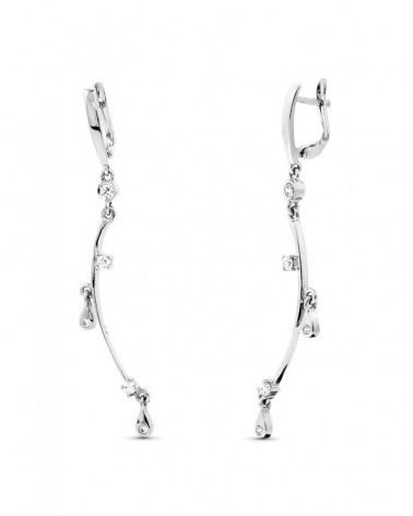 Confeccionados íntegramente en oro blanco de 18 kilates, estos pendientes cuentan con circonitas que proporcionan un brillo excepcional. Con medidas de 57x8 mm y peso aproximado 4,6 gramos, incorporan un seguro cierre catalán que garantiza la máxima comodidad y seguridad durante su uso.