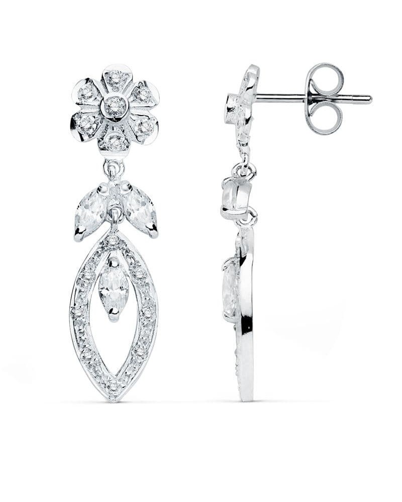 Pendientes oro blanco 18k colgantes flor circonitas