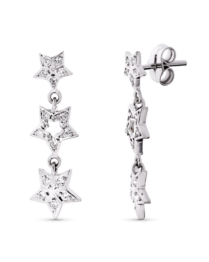 Elaborados en oro blanco de 18 quilates con acabado espejo, estos pendientes miden 27x8 mm y tienen un peso aproximado de 3,0 gramos. Las circonitas están perfectamente engastadas en cada una de las tres estrellas, y el cierre de presión garantiza comodidad y seguridad durante el uso.