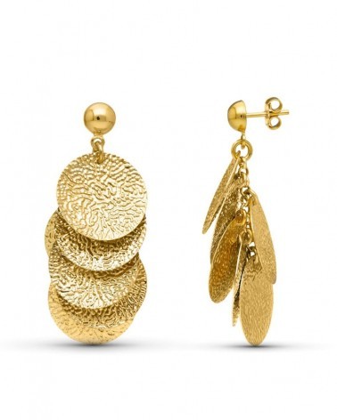 Fabricados en oro amarillo de 18 quilates con acabado pulido y texturizado, estos pendientes tienen un peso aproximado de 13,1 gramos que les confiere una presencia distinguida sin resultar excesivos. El cierre de presión garantiza una sujeción segura y cómoda para el uso diario.