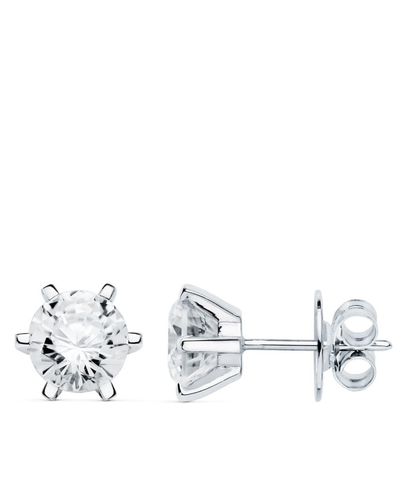 Confeccionados en oro blanco de 18 quilates, estos pendientes cuentan con circonitas perfectamente talladas que ofrecen un brillo excepcional. El engaste de 6 garras asegura la piedra de forma segura mientras permite el máximo paso de luz. Con un peso aproximado de 2,4 gramos y cierre de presión para un uso cómodo y seguro.